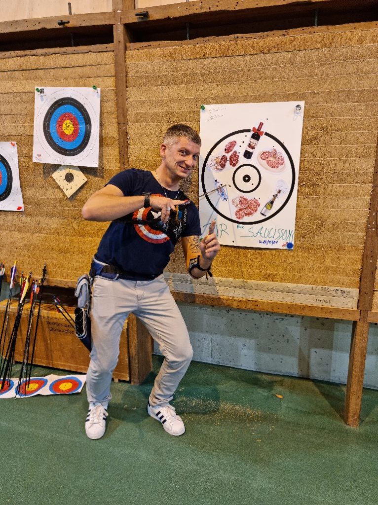 Pour le second tir nous avions tous une représentation de cochon en guise de blason. Notre objectif ? Viser les zones colorées des différents cochons. Lorsqu’une zone était atteinte, l’archer gagnait une tranche de saucisson. Nos archers étaient plus motivés que jamais pour atteindre leurs objectifs ! Surtout qu’ils pouvaient également obtenir un verre de vin ou autre boisson… C’est bien connu, tir à l’arc et saucissons donnent soif ! N’hésitez pas à cliquer sur les photos pour les agrandir !
